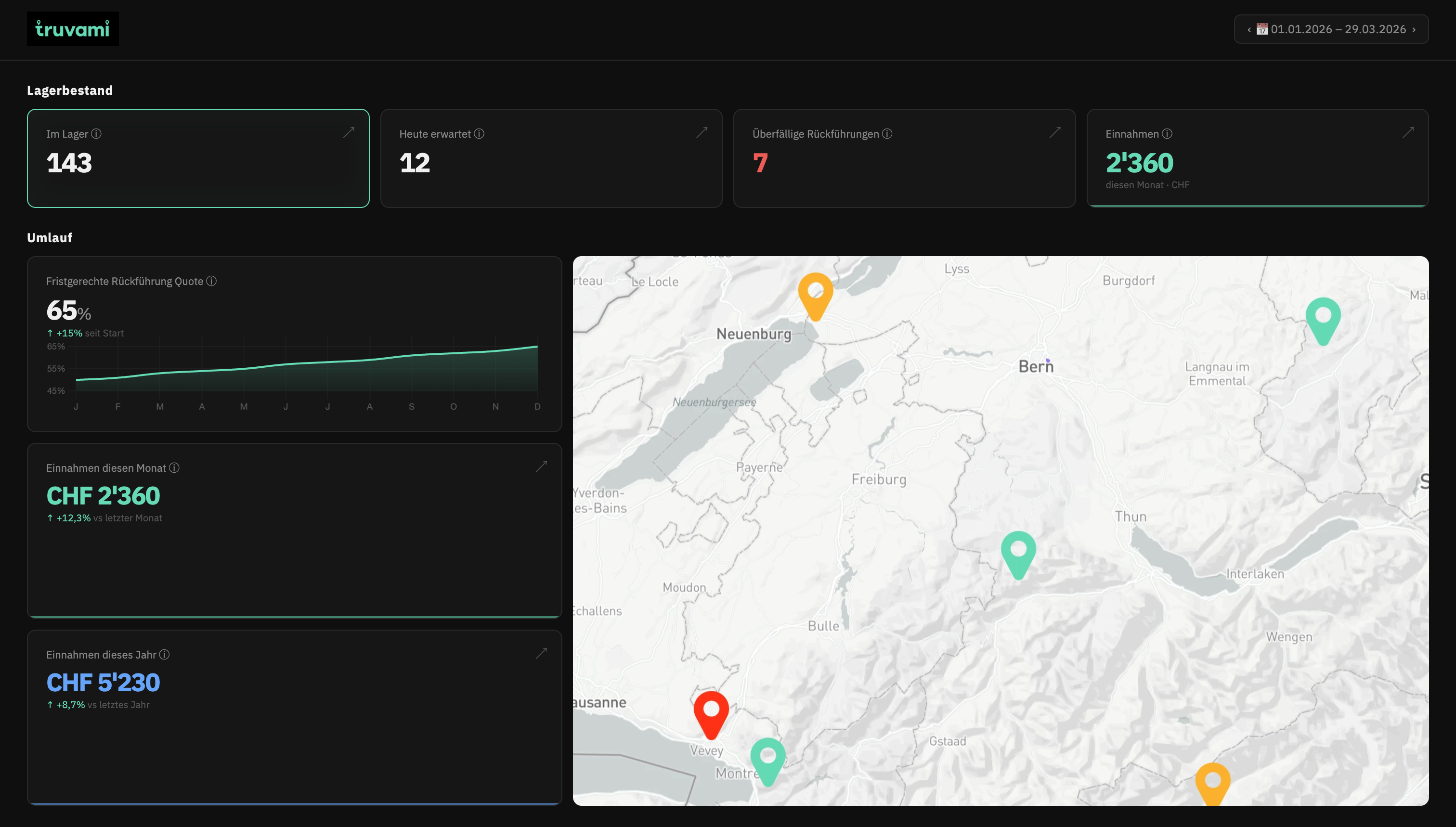Mit smarten Geofences und zuverlässigen Daten können wir Ihre Inventur automatisieren. Dank APIs, Webhooks und Kafka-Queues können wir Ihre Daten auch direkt an Ihr bestehendes System fliessen lassen.